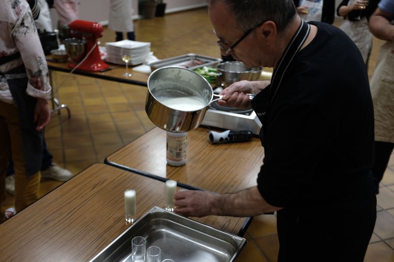 Repas de saison autour de l'asperge et de l'agreau. Variation sur le thème de l'asperge avec bar sur lit d'asperge, une crème d'asperge et une salade d'asperge. Un navarin d'agneau en plat principal