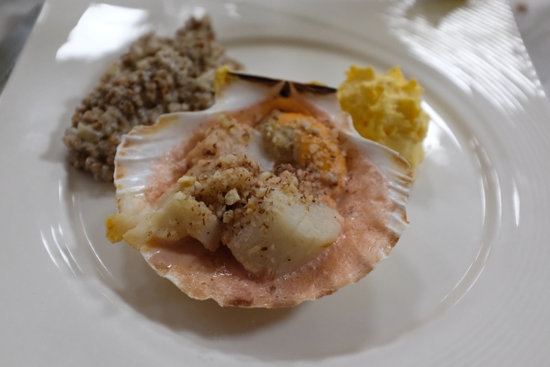 Le chef du restaurant "l'Atelier Gourmand" à Grosmagny nous a montré différentes préparations avec des Saint-Jacques : Tartare de Saint-Jacques, Saint-Jacques dans sa coquille, betterave, noisette. Syphon butternut. Et en dessert : Gelée de crêpes, fleur d'oranger, glace Grand-Marnier